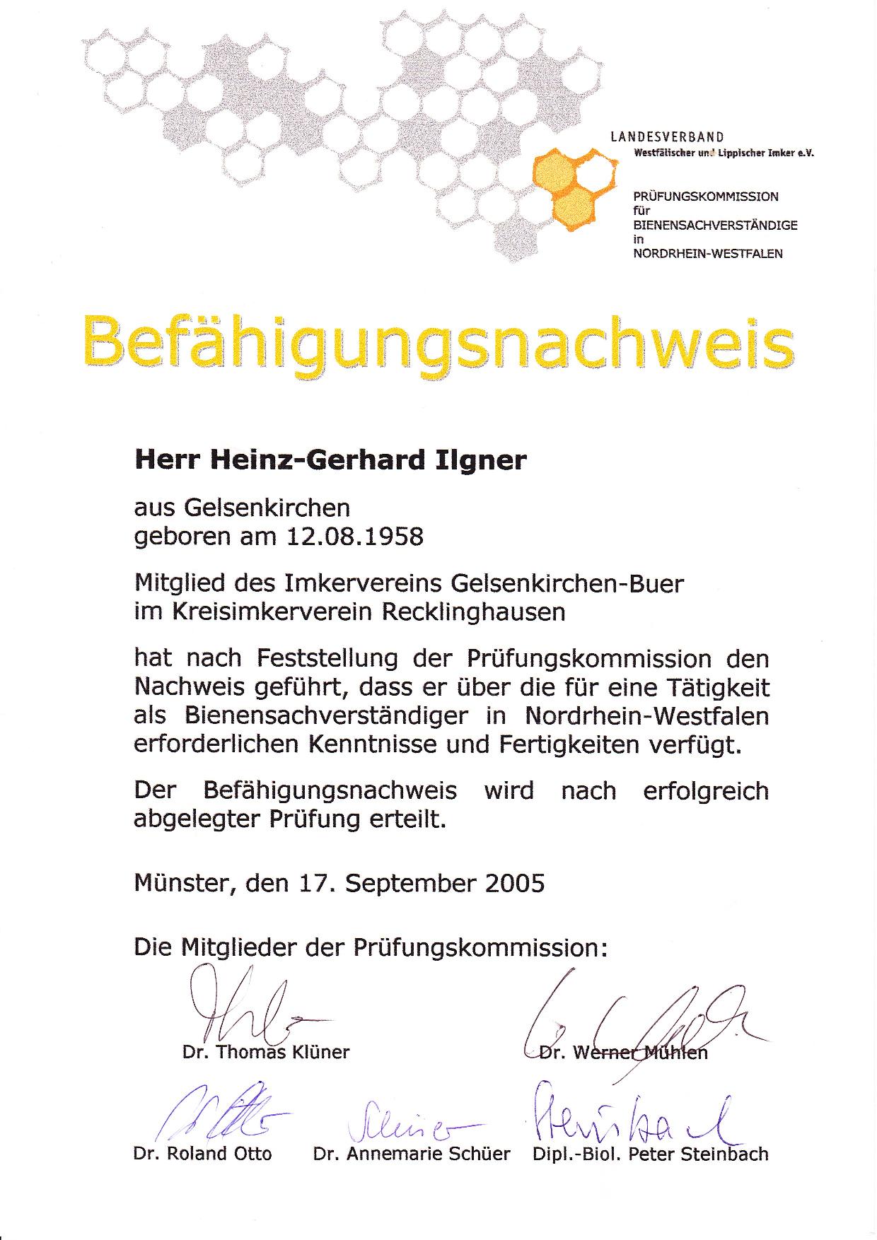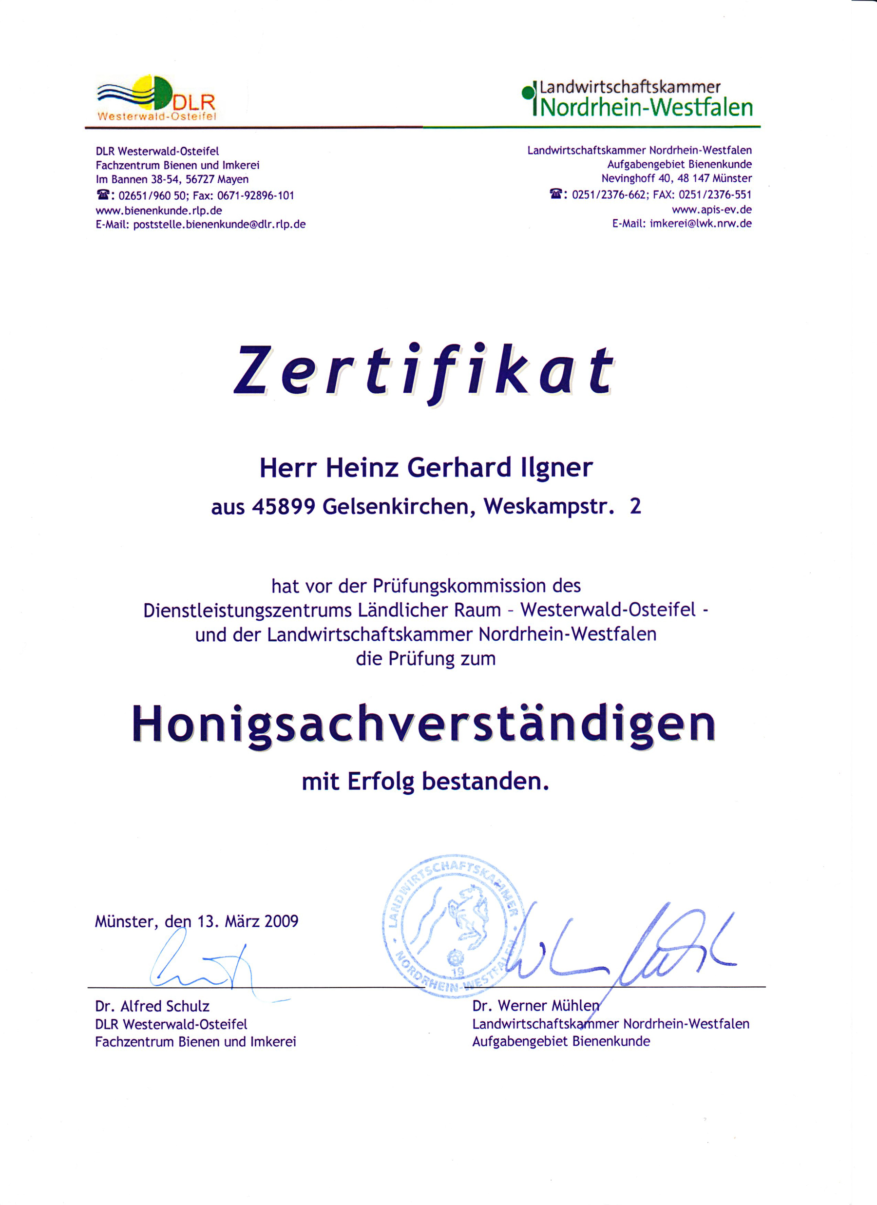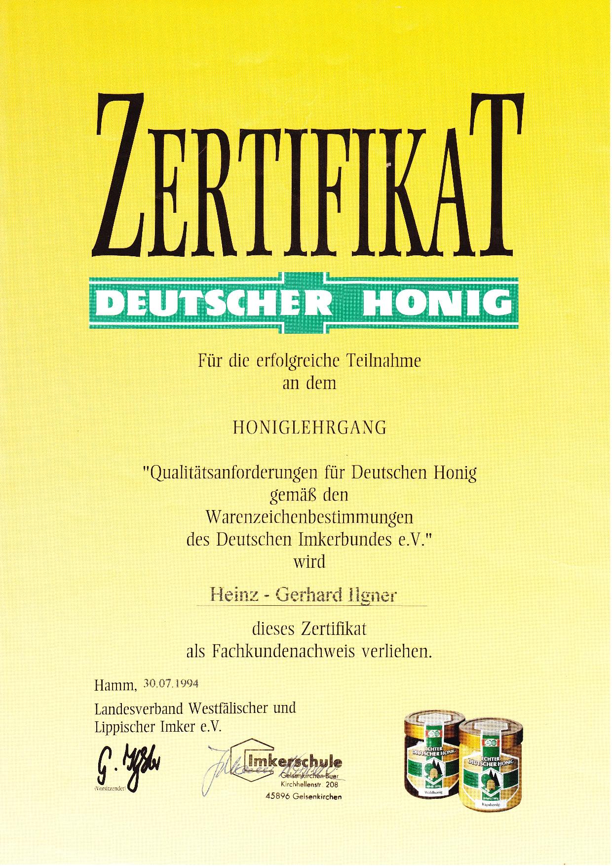 Zertifikat über die erfolgreiche Teilnahme am Honiglehrgang